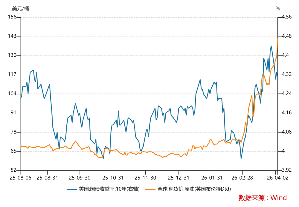 原因是油价失控并不是正常繁荣中的涨价,而是典型的供给冲击型通胀。它会迅速传导成滞胀预期,引发宏观风险定价。从市场表现看,这种变化已经初现端倪:一方面,油价持续攀升;另一方面,美国10年期国债收益率却走出了先涨后跌的路径。