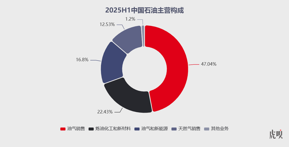 比方中国石油看起来是上游,实际上并不是纯粹的市场化受益者。从2025年上半年的主营业务来看,中国石油的油气销售收入贡献了47.04%。
