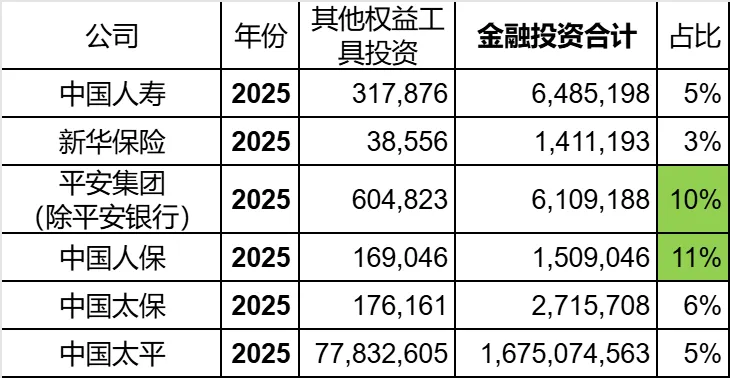 可以看到,其他权益工具投资金额占总金融投资的占比上,人保和平安大幅度领先。