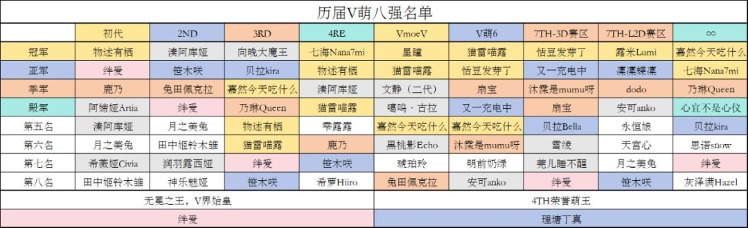 这也让V萌这个民间赛事多了一层意义:它成了观察V圈流量变迁的一个生动切片:在哪个阶段、谁曾真正火过,看看当时V萌的战况,便能窥见一二。