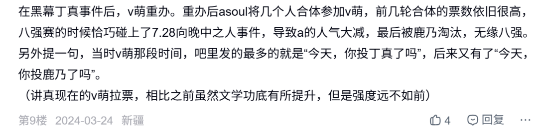 在这样的氛围下,本届16进8比赛中,A-SOUL对阵鹿乃。贴吧迅速出现了“今天你投鹿乃了吗?”的集中拉票倡议。最终,在鹿乃原生粉丝并未大规模参与贴吧投票的情况下,凭借着“我不管谁赢,我只想要A-SOUL输”的外部投票,A-SOUL止步八强——这次比赛的结果此后被不少A友(A-SOUL的粉丝)当做自己举目皆敌的证据。