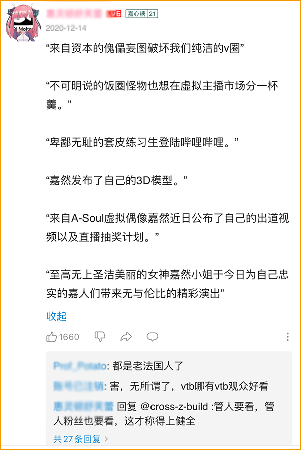 然而,看似集结了五人力量的A-SOUL并未展现出叠加的战力。此时,AU(A-SOUL粉丝)频繁的“万象天引”式引流,以及部分攻击性较强的言论,使得A-SOUL的舆论环境变得微妙:确实有不少人因此入坑,但也有观众因为极端粉丝“A是A,V是V”的AOE切割,以及部分粉丝将3D女团视为“正统”、嘲讽其他Vup为“皮套轮椅人”的言行,而产生切实的反感。