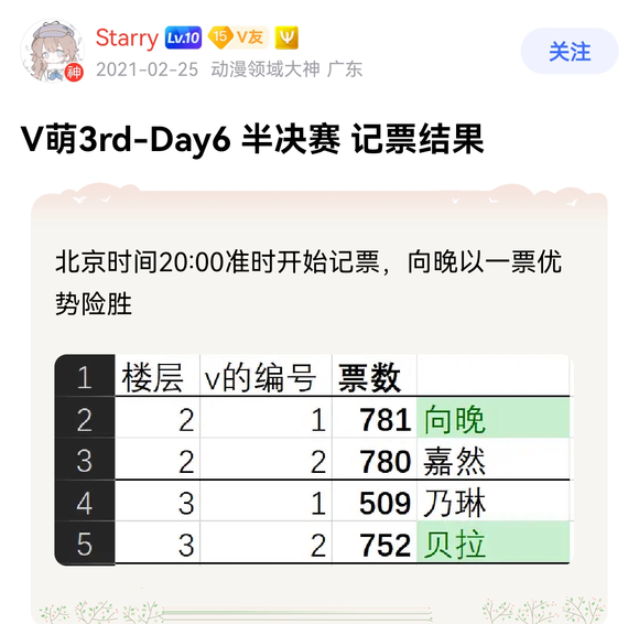 颇为戏剧性的是,即便是惹到了一位前萌王导致了向晚聚票,但最终,向晚也仅以一票之差险胜,足见当时嘉然在V吧的基本盘之扎实。