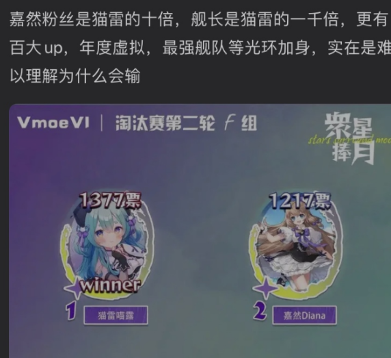 当然,有些近两年刚接触Vup、特别是前不久随着“鸣潮大引流”才关注V圈的朋友,也会觉得很奇怪。毕竟嘉然依然是人气虚拟主播,再加上那些如病毒般传播的“国V goat”长图,很多人的潜意识里,普通的票选冠军早就拿到手软了。