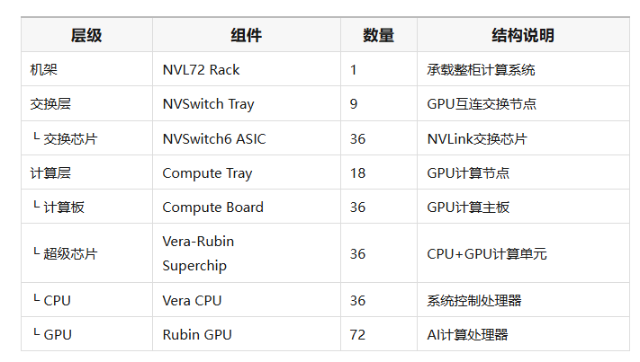 Rubin NVL72正是这一理念下设计的系统。整柜内部集成: