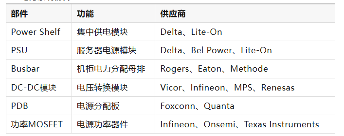 电力传输路径通常为:AC输入 → PSU → Busbar → DC-DC → GPU计算节点