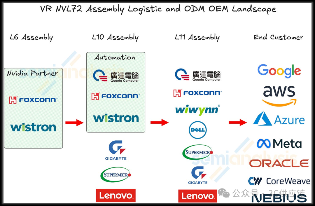 在更上游的L6层级(板级PCBA),Wistron与Foxconn仍然是Blackwell与Rubin平台的主要制造商。而在最终的L11阶段,各ODM厂商再将Compute Tray与NVSwitch等模块集成至NVL72机架,完成整柜AI服务器生产。