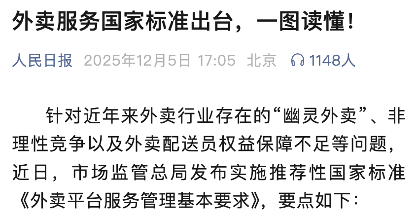 外卖服务国家标准要求落实配送员权益,包括劳动时间控制、调度算法优化等。