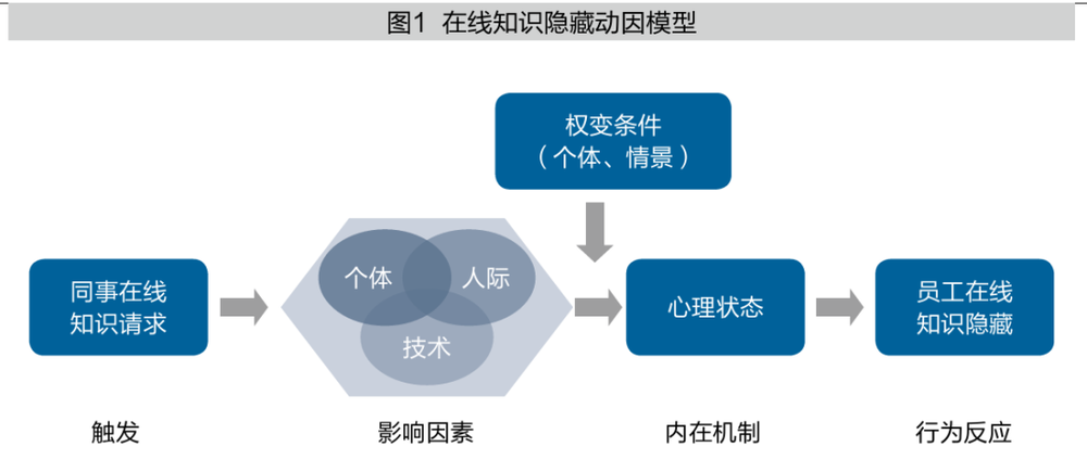 在线知识隐藏现象在当前在线协作的数字化办公时代日益普遍。知识隐藏是阻碍知识转移的行为,学者康奈利(Catherine E.Connelly)将其定义为个体故意隐瞒或隐藏他人所请求的知识。近年来,随着虚拟团队、远程办公新型工作方式的普及以及企业社交媒体在线沟通媒介的广泛应用,知识隐藏已经逐渐从传统面对面互动中逐渐转到“在线”互动场景中。普华永道关于远程办公的一项调查显示:在远程工作环境中,60%的员工表示他们会选择性地分享知识,尤其是在涉及晋升或竞争性项目时。在面对面沟通过程中,员工面对同事的知识请求,员工可能会采取假装答应、假装不明白以及告知信息涉密等策略进行知识隐藏。在线协作环境不仅为员工的信息获取或分享提供了便利,也为员工在线知识隐藏提供了便捷,在线知识隐藏不仅能够采取推脱、装傻等策略,还能够利用在线沟通媒介的异步性、缺乏非言语线索等特点实现知识隐藏。与面对面知识隐藏类似,在线知识隐藏同样具有触发先行性、主观意识性的特征,这一行为是发生在同事在线知识请求后的故意行为。媒介的条件性是在线知识隐藏与面对面知识隐藏的关键区别,这一特征表明在线知识隐藏必须通过电话、邮件、在线协作软件等计算机与通信技术媒介实现。