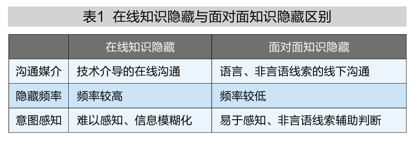 意图感知的削弱:从清晰辨识到模糊难辨。在面对面沟通中,知识请求者能够通过微表情、语气以及肢体动作等判断对方是否故意隐藏知识。然而,在在线沟通环境下,信息的传递方式更具模糊性,这使得知识隐藏意图更难被察觉。组织内的日常沟通主要是基于文本的在线沟通,这极大削弱了信息交流中的情绪表达和非言语线索,知识隐藏者可以通过回复“我正在忙”从而掩盖自己的隐藏意图。基于文本或音频的在线沟通具有不可视性的特点,会导致员工的隐藏意图不会被对方察觉。在线协作过程中,知识隐藏者还能够利用信息不对称和异步性的在线沟通媒介特征,通过延迟回复或提供部分信息从而使得知识隐藏更加隐蔽(见表1)。