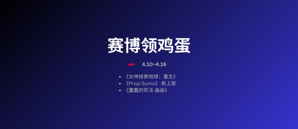 本周赛博领鸡蛋略敷衍,Epic 把上周厂商限免的游戏《女神救地球:重生》算进了自己的限免,实际上上周的限免截止日期就是4.16。所以,本周只有一款 PC 新游戏《Prop Sumo》和一款手机游戏《Dumb Ways to Draw》。