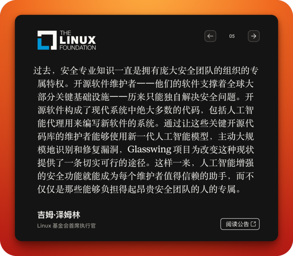 Glasswing计划的成员包括苹果、亚马逊、谷歌、微软、英伟达、思科、Palo Alto Networks、Linux基金会等顶级公司和机构,另有40多个组织获得扩展访问权限,总计参与机构超过50家。