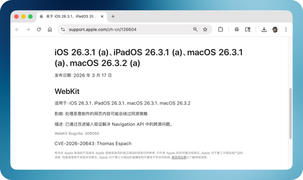 但这次不一样了。今年,苹果从iOS/iPadOS/macOS 26.1版本开始启用「后台安全改进」政策,第一次实际投入使用,则是在iOS 26.3下的小版本上,也即开头提到的WebKit漏洞修补。