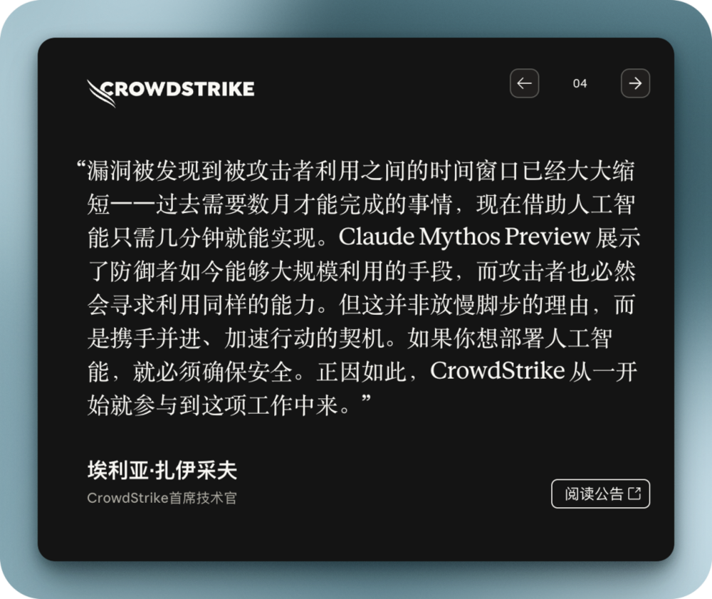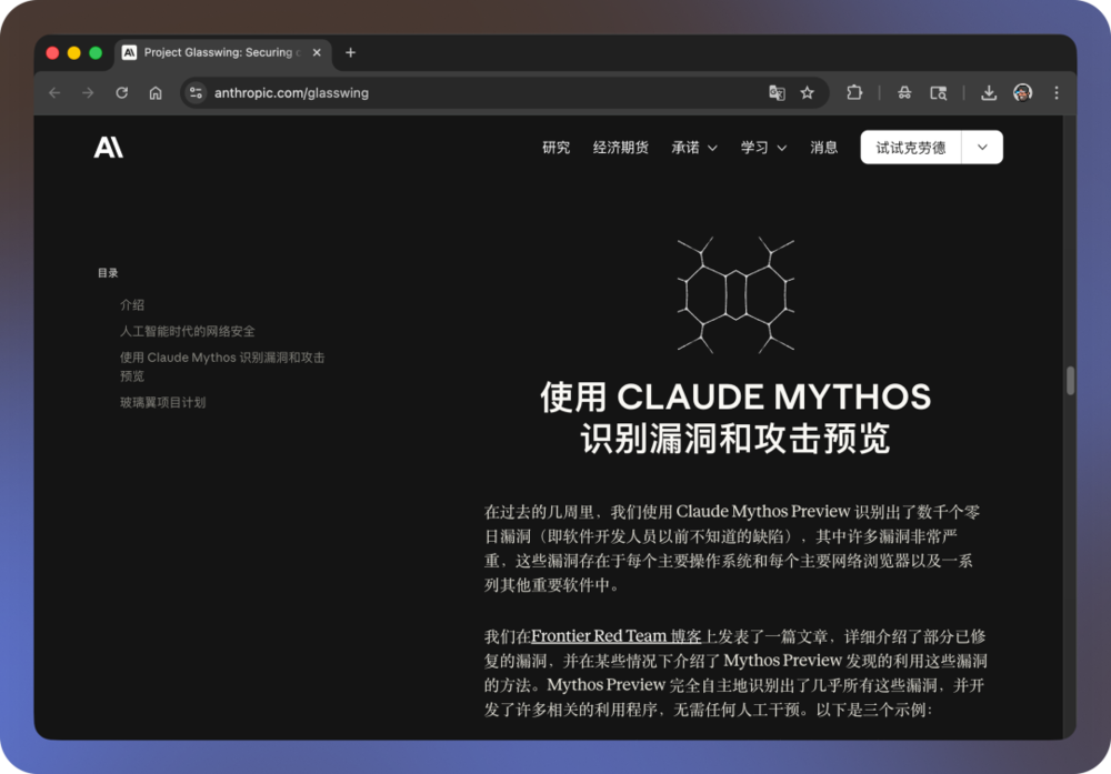 于是,A社提出了Glasswing这个「内测计划」:与其把Mythos锁进保险柜,不如让潜在暴露风险最高的巨头公司和机构们先拿到它,扫描自己产品里的漏洞,在更大范围扩散之前把洞堵上。