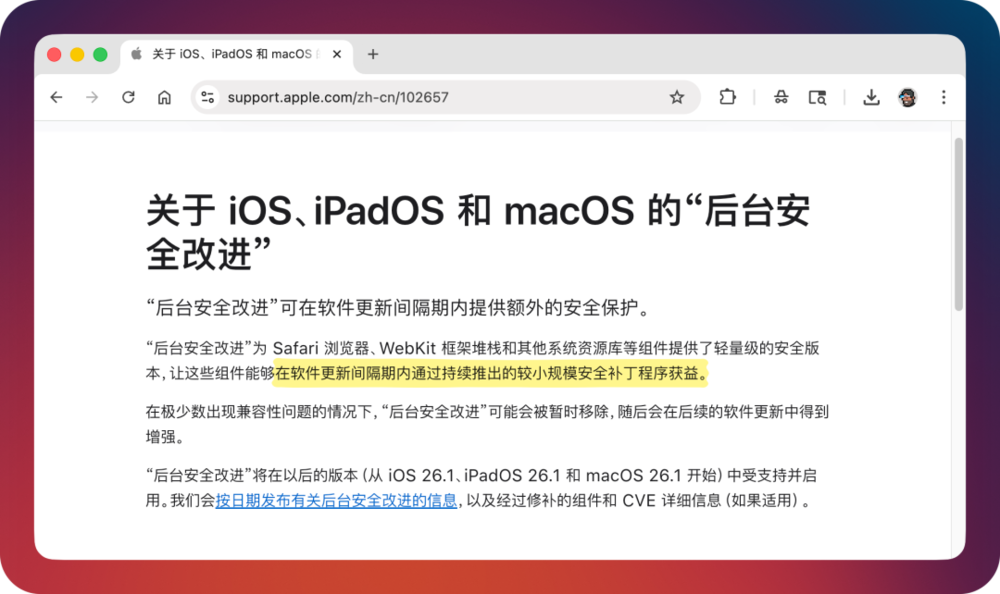 「后台安全改进」的官方说明其实写的很简单,但通常字少事大。苹果的逻辑很明确:在今天这个时代,安全这件事不能等,必须加速。