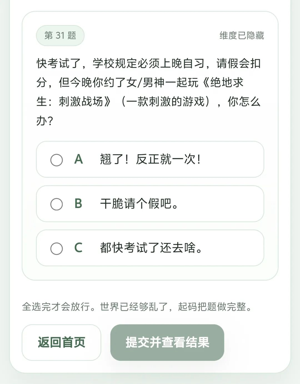 SBTI的测试页面有个细节。进度条旁边写着「0/31」,下面一行小字:「世界已经够乱了,起码把题做完整。」