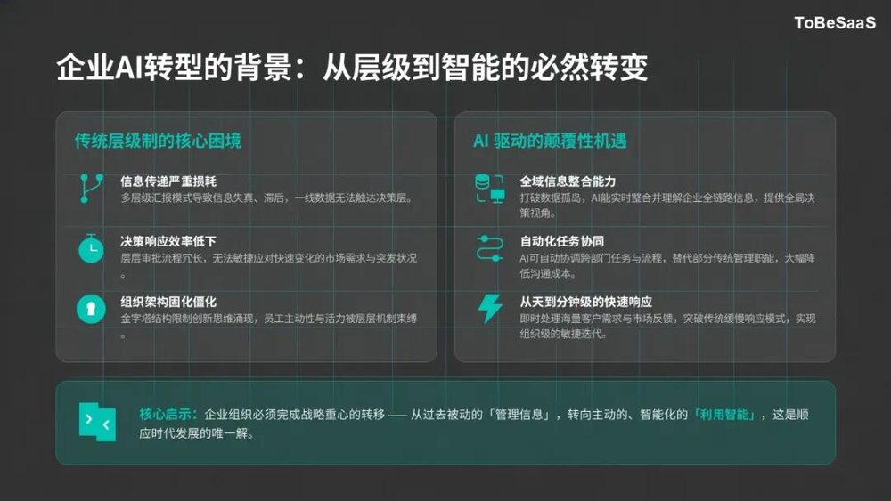 SaaS提供标准化的能力底座,解决了企业基础能力的有效供给问题;AI作为组织中枢,解决了传统组织的信息黑箱、速度不均、内耗严重等痛点,实现组织可读性提升与整体输出最大化;人作为价值核心,为整个架构提供方向指引与价值校准,确保组织创新活力与发展方向的正确性。