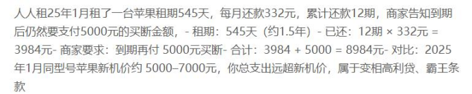 有用户投诉称,租赁苹果手机(如市价约5000-7000元或9999元的机型),最终需支付的总费用(如8984元或13906.2元)远超手机本身价值,且平台通过拆分“租金+续期费+买断费”的方式隐藏真实高利率,严重超出法律保护的利率上限(13.8%/年)。
