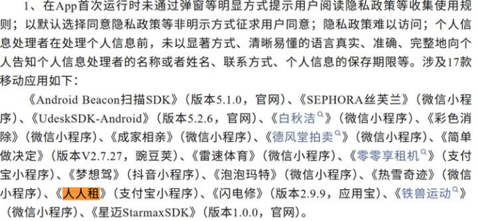 国家计算机病毒应急处理中心曾于2025年8月、2026年3月两次通报“人人租”APP及支付宝小程序存在违规问题,涉及隐私政策未明确信息收集范围、未提供便捷的撤回同意方式、以默认选择同意隐私政策等非明示方式征求用户同意、违规收集个人信息等。