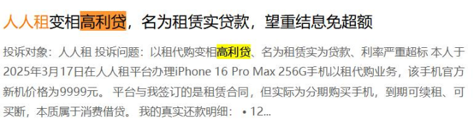 截至2026年3月15日,投诉平台上针对“人人租”及相关入驻商家的投诉已累计达18227条,其中近30天投诉量就有337条,核心投诉之一便是此类高息收费问题。