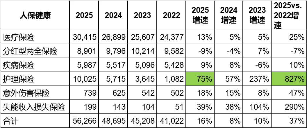 人保健康的长期健康险主要是3个险种:医疗保险、疾病保险、护理保险。从上图看,护理保险表现尤为突出,2025年增速高达75%,而三年来总的增速高达827%。活生生的从一个小险种,一跃成为人保健康的第二大险种,年保费已经到了百亿规模。并且护理保险目前仍然是一片蓝海,期待人保健康在这个赛道继续狂奔。