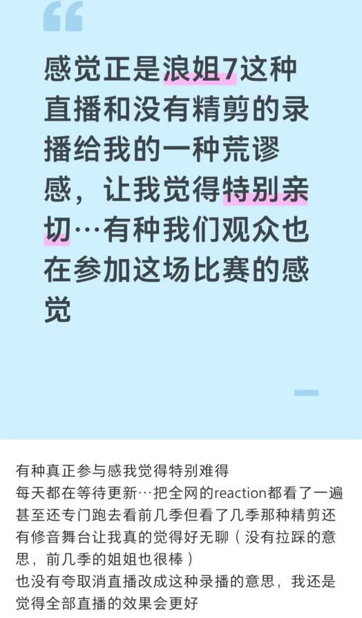 「包容不必那么完美的唱跳、不必那么体面的对白、不必时刻精彩的漫长直播,我们发现了更多有趣的灵魂,坦率展现自我的品质和重新出发也不惧风浪的勇气。」