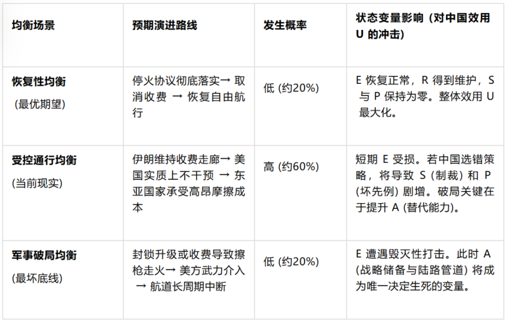要透视当前危机的底层逻辑,必须建立一个涵盖多重变量的博弈论分析框架。在此次危机中,美国试图以最低成本消耗亚洲对手,伊朗试图将海峡转化为资金提款机,而中国则必须在能源生存与国际规则之间寻找最优解。为此,我们构建一个针对中国战略选择的“综合效用模型”。