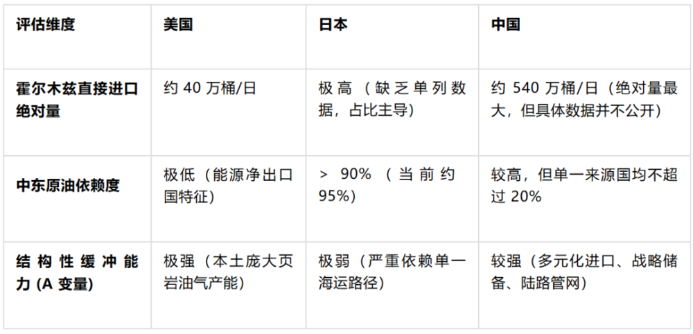 为了直观呈现这种物理结构上的不对称性,下表对中美日三方在本次危机中的核心能源暴露度与结构性缓冲能力进行了量化对比评估: