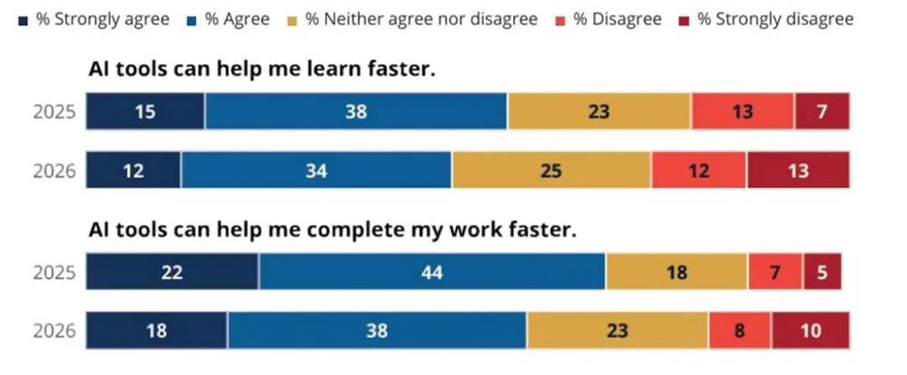 在他们看来,AI并没有更好地帮助他们解决现实问题。无论是加速学习还是提高工作效率,AI实际发挥的作用,正越来越受到年轻人的质疑。仅有28%的年轻人表示,他们信任AI辅助完成的工作,这一比例较去年下降了4个百分点。