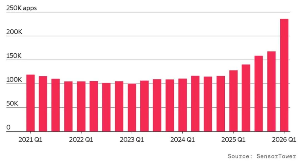 这种“AI过剩”同样正在更广泛的数字经济中发生。过去十年间,苹果应用商店的新应用数量,整体呈下降趋势,但这在2023年后开始逆转,并在今年一季度彻底改变。这与AI编码的崛起高度同步。然而,供给的爆炸并未带来价值的同步增长,反而在稀释质量与用户注意力,同时也为平台的审核体系带来了前所未有的压力。