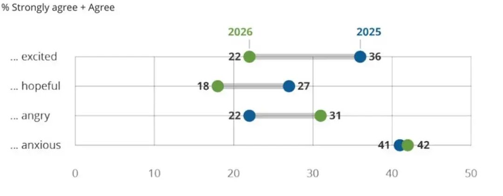 在日常生活中,他们的AI使用频率,基本没有变化。然而,他们对AI的情绪态度发生了明显变化:兴奋感(excited)下降了14个百分点,期待度(hopeful)下降9个百分点,而愤怒上升了9个百分点,焦虑则仍维持在40%以上。