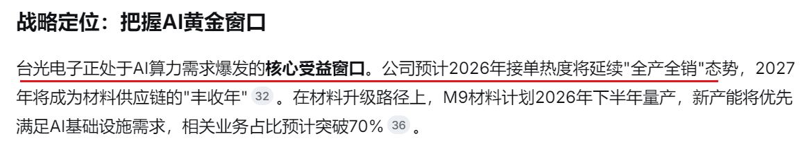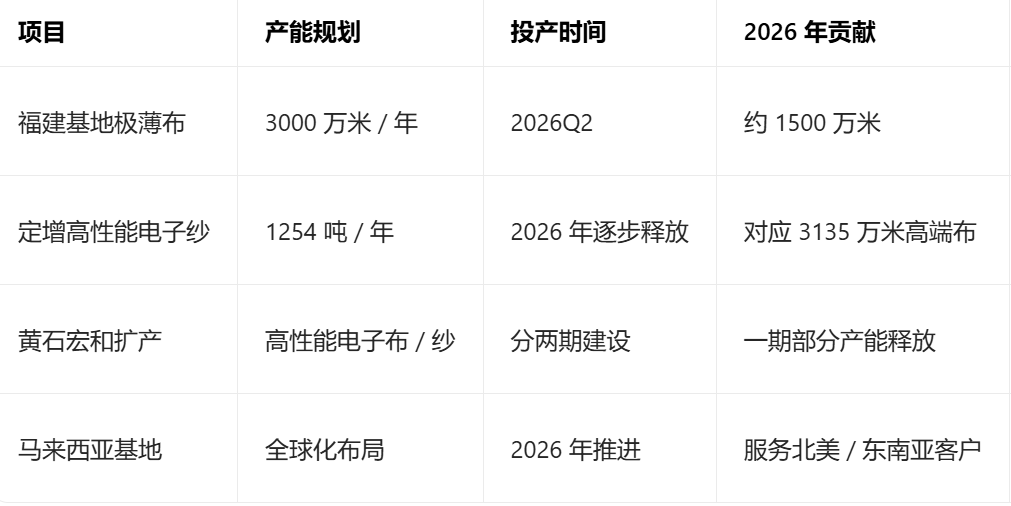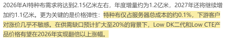 中长期层面:公司已实现Low-DK(一代/二代)、Low-CTE、Q布全品类覆盖,性能媲美国际头部厂商,并已获得全球头部CCL客户的认证和批量供货-10。其2026年特种布产能目标为3,600-3,800万米,2027年将大幅跃升至约1.3亿米。产能释放主要集中在2026年下半年,届时将充分受益于海外需求高峰。