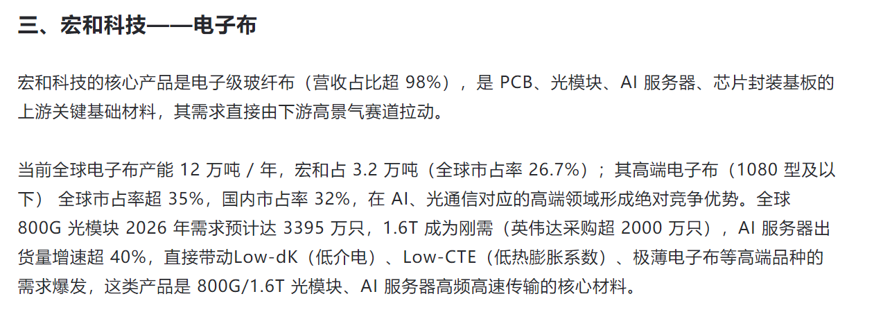 宏和科技 2026 年迎来 "产能释放 + 产品升级 + 客户拓展 + 价格上涨" 四重共振,AI 特种布成为最大增量引擎,成为 AI 算力基础设施上游核心受益标的。