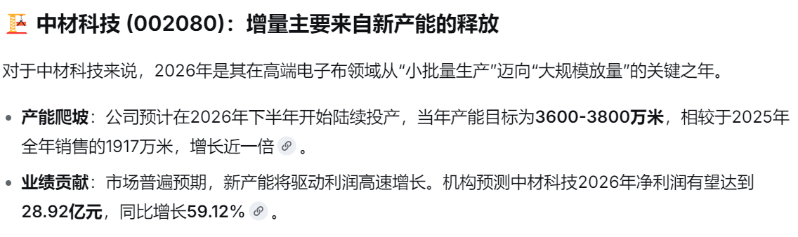中材科技:作为新进入者,正在大力扩张特种玻纤布产能,已投资13亿元建设年产2600万米项目。其“特种布产能布局加速”,有望在行业高景气中分得一杯羹,市场预期其2026年高端电子布业务可贡献净利润约7.7亿元。
