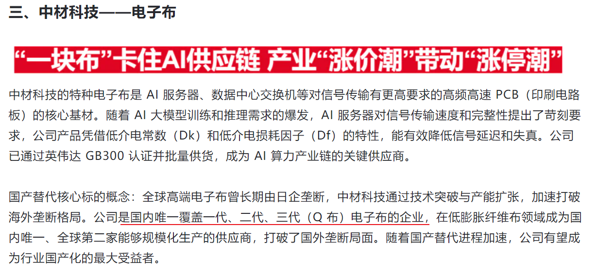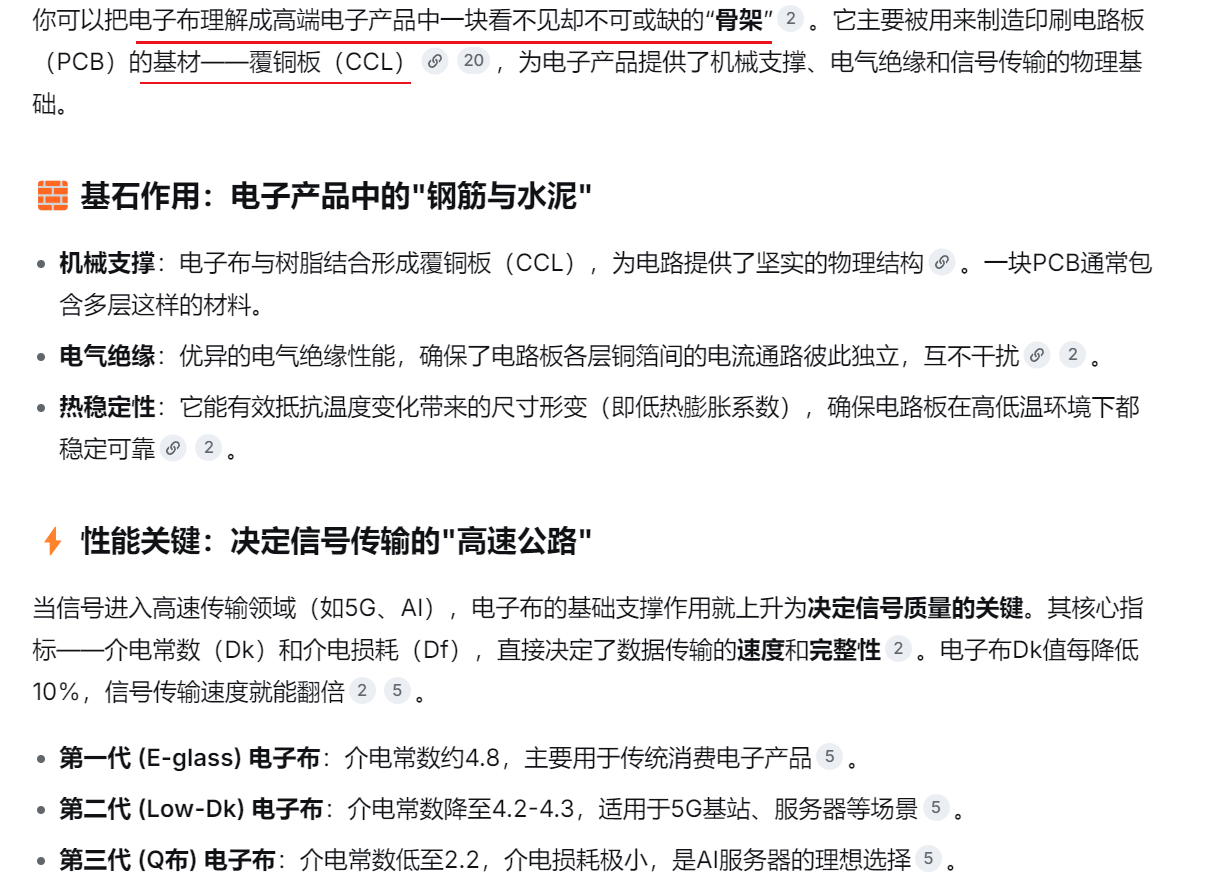 AI服务器与高端电子布:AI服务器的快速增长,直接拉动了对高性能、低损耗电子布(如Low-Dk、Low-CTE电子布)的旺盛需求。高端电子布产品正出现“一月一调”的连续提价现象,行业景气度极高。