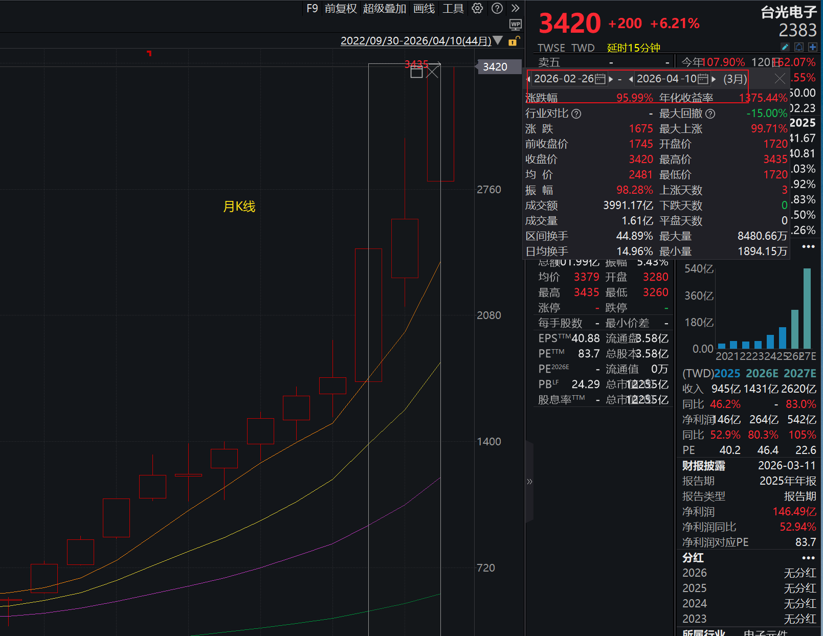 台光 (2383.TW) 股价大涨,2-4 月涨幅显著,2 月涨约 40%,3 月涨约 6%,4 月截至 12 日涨约 24%。AI 推理端需求持续超预期,台光电子订单排单周期从 1.5 个月大幅延长至 4-6 个月。
