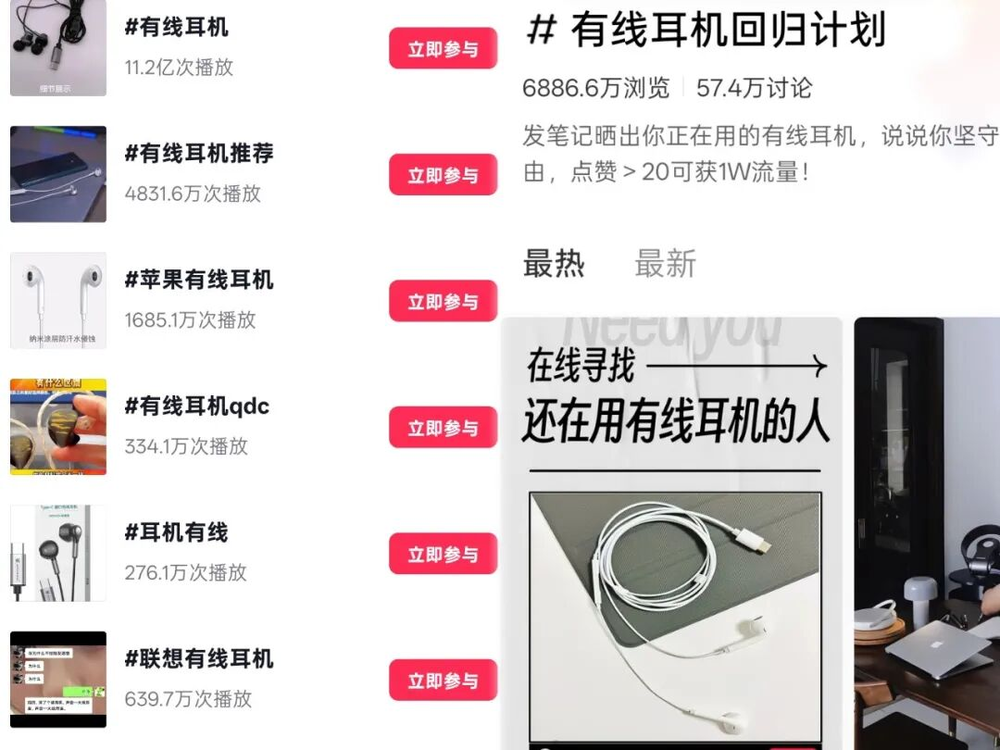 根据调研机构Circana报告显示,有线耳机继去年实现全年3%份额增长后,今年第一季度销售额更是暴涨20%,这也是有线耳机在经历5年销量下滑后的罕见反弹。而在社交平台上,有线耳机的相关tag也在默默扩大声量,仅在抖音相关词条播放量就已经超过11.2亿;在小红书,秀出有线耳机产品的“有线耳机回归计划”也已引发超过6886万浏览量、57.4万讨论。