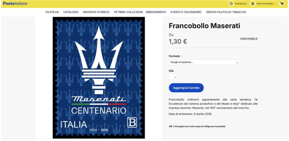 这枚特别纪念邮票于2026年4月9日在罗马发行,旨在庆祝玛莎拉蒂著名的三叉戟标志诞生100周年。该邮票由意大利邮政发行,面值1.30欧元,是“意大利制造与产业卓越”系列邮票之一。