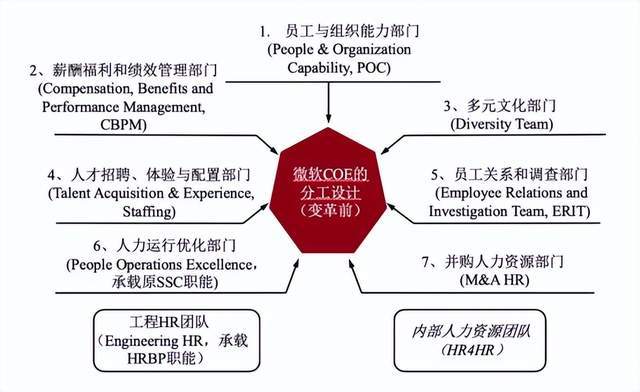 客观来看,微软之前的HR团队就是按照传统人力资源部的分工进行设计的。公开资料显示,其COE包括7大部门: