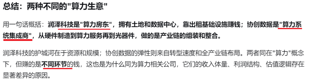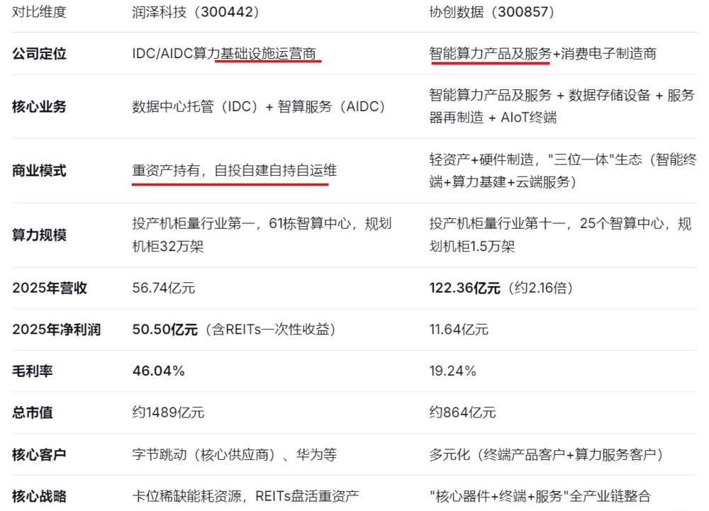 润泽科技是典型的重资产运营商:依托自投、自建、自持、自运维的高等级算力中心,延伸投资高性能服务器、网络设备等算力设备,自主搭建智算集群,为AI大模型训练、推理提供智能算力服务。它的核心资产是物理数据中心,价值来源是稀缺的土地、电力、能耗指标等资源。