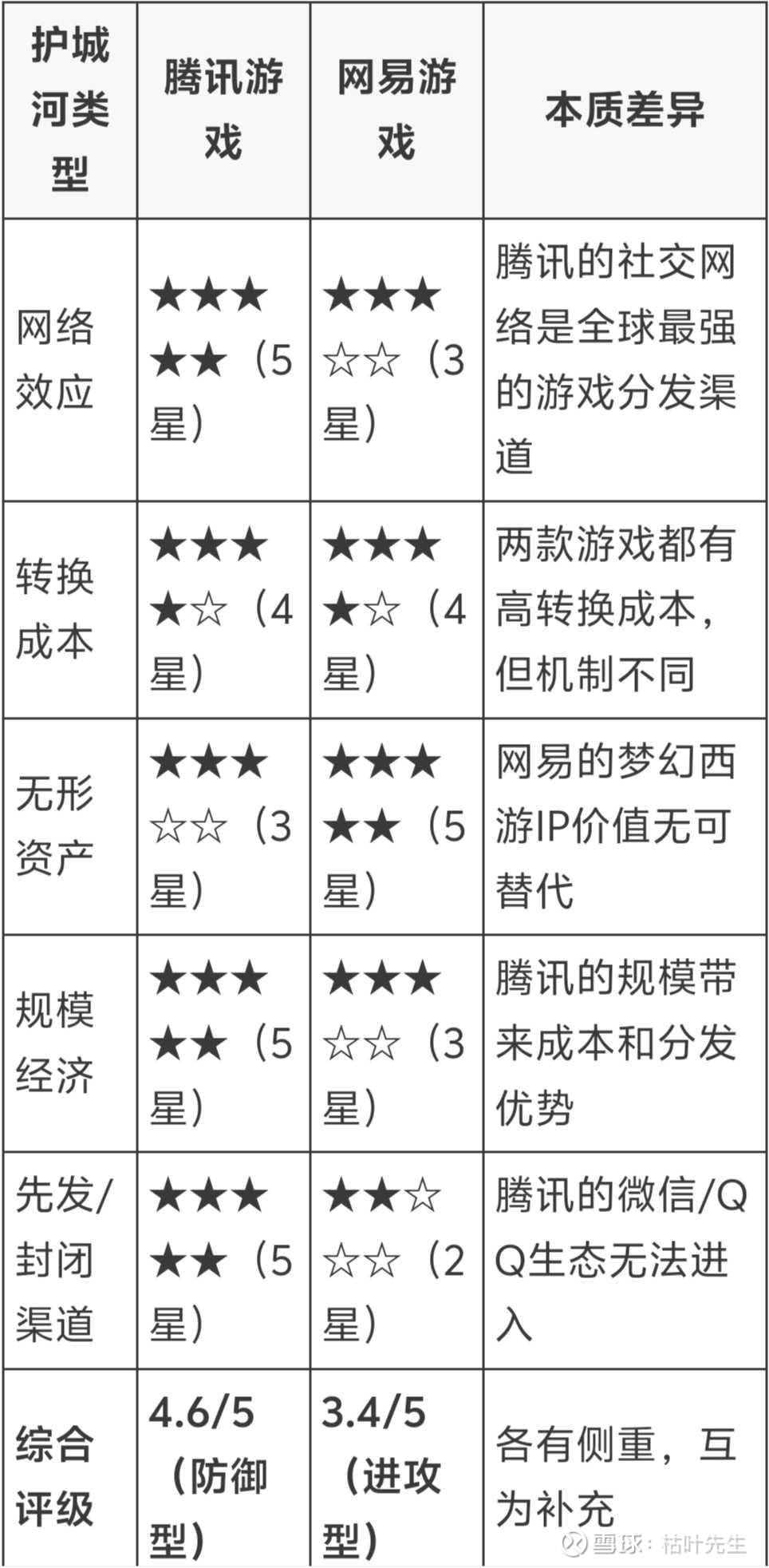 腾讯的社交护城河是"宽护城河",防御性强但进攻性受限;网易的研发护城河是"深护城河",进攻性强但防御性受限。