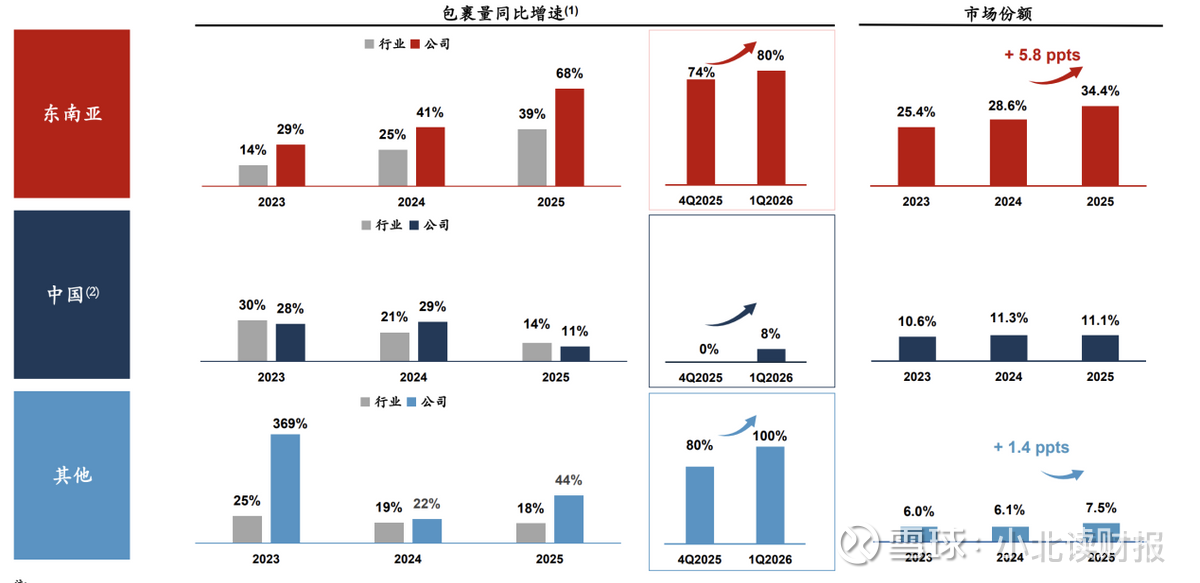 Q1同比新增的17.26亿件包裹中,海外市场构成了核心增量(东南亚贡献12.30亿件,其他市场贡献0.77亿件);同时,作为全球网络大本营的中国市场,依然提供了稳健的规模支撑。