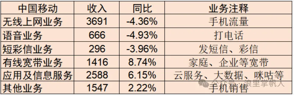 中国移动的无线上网(流量)、语音和短信业务收入下滑,宽带业务和应用及信息服务(云服务、大数据)收入保持增长,可以理解为与个人相关的基础通信服务收入下滑,政企业务收入增长。