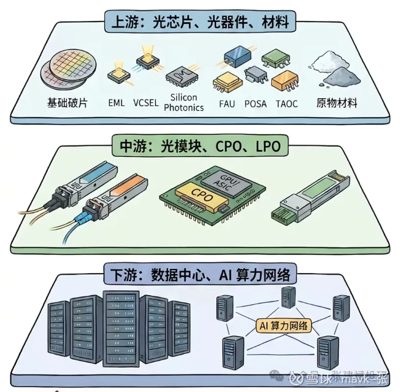 光通信远不止我们熟知的光模块、光纤这两个细分领域,而是一条结构完整、分工清晰、环环相扣的全产业链,每个环节都在AI算力网络中扮演着不可或缺的角色,共同构成了“光之赛道”的完整版图。