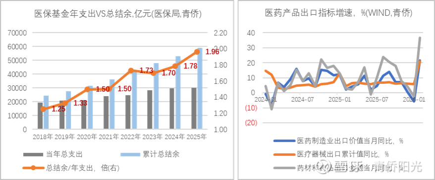 在此背景下,快速累积的医保结余可能会提供额外的助力。下面左图统计了2018-2025年国家医保基金的年度支出和年末结余数据,医保基金年支出从1.94万亿增至3.00万亿、增长了+54.5%,同期医保基金累计结余从2.43万亿增至5.90万亿、增长了+142.3%,“累计结余/年度支出”比值从1.25倍增至1.96倍。按城镇职工医保的历史数据和个人对医保的理解,这个比值在中性区间可能在1.5-1.7倍之间,如果掉到1.2倍以下是明显不足、可能会触发强力控费来确保基金安全,而如果升到2.0倍以上有可能会被定义成相对过剩、需要刺激支出来提高资金效率。当前这一比值因为2024-2025年的支出增长乏力而迅速逼近2.0,医保局通过刺激支出来提高资金效率的压力在上升,事实上,2026年4月1日落地的医保配套肿瘤药报销新政大幅提高了肿瘤患者门诊就医的报销比例,未来2-3年里,医保局推出更多刺激医保支出新政的概率是不容小觑的,这将为行业增长加速提供更有利的国内市场环境。