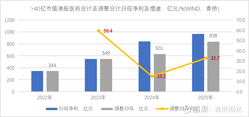 除了营收端趋势性加速之外,利润端的综合利润率水平也在持续改善。>40亿市值港股医药的合计归母净利从2022年的344亿增至2025年的968亿,年化增速接近40%。若剔除那些影响超过20亿人民币的异常扰动事件(比如2024年金斯瑞会计变更性盈利210亿、2025年和黄与药明出售资产及三生大BD的一次性收入等),调整净利将从2022年的340多亿、2023年的接近550亿、到2024年的630多亿、再到2025年830多亿,年化增速也超过30%。其中,2024年调整净利增速有明显回落,部分原因是行业景气度骤降背景下,国控/白云山等加大资产减值力度而导致利润萎缩。而2025年调整净利增长再度加速,主要受到了2股增量的合力推动:1. 百济/信达等新兴biotech成功扭亏,从利润拖累点变成利润增长源(仅百济一家就贡献了超60亿人民币的边际增量),与此同时,新兴biotech公司的BD收入大增也带来不小的额外利润增量;2. 华润/国控/白云山等传统医药公司,在行业景气度企稳回升后,归母利润从萎缩下滑变成恢复增长,在边际上也贡献不少的利润增量。未来2-3年,BD交易热度预计会有所回落,不过在产品营收持续高增驱动下,新兴biotech作为整体预计仍将贡献显著的利润增量;而传统医药公司,在行业整体景气上行背景下,预计也能实现稳健的利润增长。