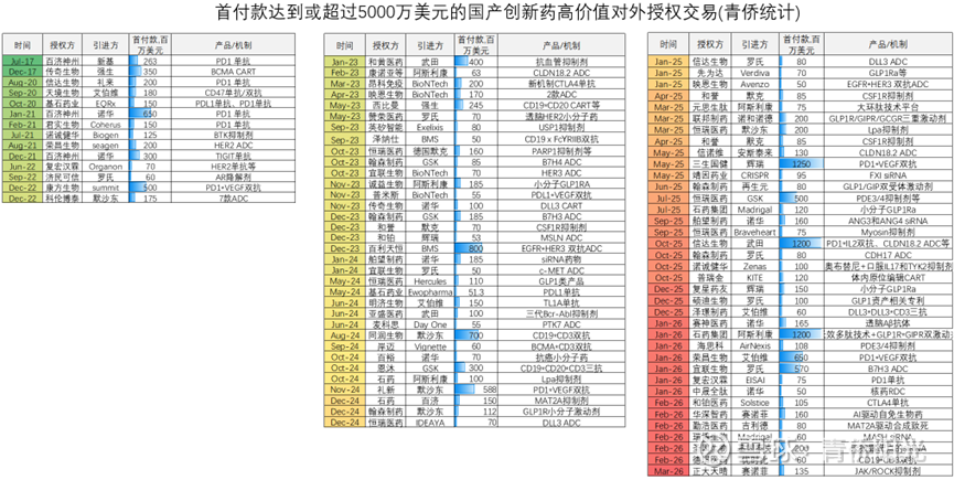 下图汇总了首付款超过5000万美元的国产创新药高价值对外授权交易,从2017年之前的空空如也,到2017-2022年的少量出现,再到2023-2026年的爆发性涌现,中国创新药企正在集体走向全球新药研发的中心舞台。
