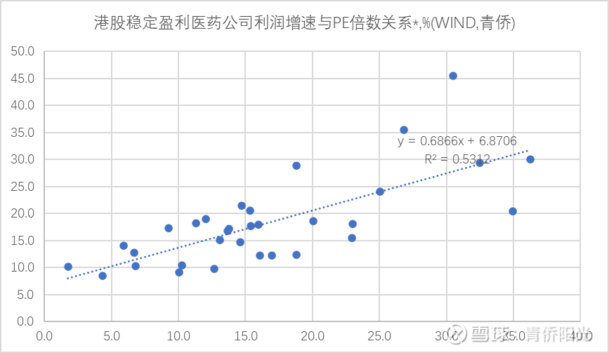 比如,我们汇总统计了2021年之前上市、已经实现稳定盈利、且具备一定市值的港股医药公司自2006年以来的历史PE中位值与归母净利增速中位值,然后去掉两端过度偏离的少数异常值,得到如下散点图。可以看到,稳定盈利的港股医药公司,其PE倍数与归母净利增速之间存在着较明确的线性相关关系,比如:净利0%增长的公司,PE可能只有6-7倍;净利10%增长的公司,PE可能13-14倍;净利20%增长的公司,PE可能20-21倍;净利30%增长的公司,PE可能27-28倍。然后,业务前景比较悲观或乐观的,在此基础上相应折价或溢价,但多数时候这里的折溢价幅度不会太大。这很可能会导致某些业务持续稳健增长但增速中枢不断下降的公司,EPS不断抬升而PE不断下降,几年下来,利润大幅增长而股价却原地踏步。PE倍数与利润增速之间较好的对应关系,意味着市场上的主流投资人很可能就是根据业绩的加减速来决定目标PE的上下调整。比如一家已经稳定盈利且30%增长的公司,第二年给的指引仍将实现15%的稳健增长,很可能会引发股价显著下跌而非稳健上涨。这未必合理,但它可能是我们必须尊重的市场规律。