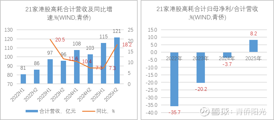 相比之下,港股高耗的变化趋势则正好相反:2023H2-2025H1的景气度大幅低于预期,2026年反而可能加速,行业整体将从低景气回升到中等景气状态,而估值仍处于入价不足的状态。一方面是国内通缩缓解+DRG消化,为高耗景气复苏提供有利的市场环境;另一方面是2021年前后进临床的一批创新产品即将陆续迎来收获期,增加行业增速的同时也会提高企业之间的差异化水平;此外,高耗出海也继续保持强劲增长。下面左图汇总统计了21家港股高耗公司的合计营收及同比增速,从2025H1的同7.3%到2025H2的18.2%,加速趋势十分显著。而且,营收规模居前的8大公司,2025H2的同比增速都高于2025H1,说明增速改善是个行业性的普遍现象。下面右图汇总该21家公司的合计归母净利与合计营收的比值,可以看到整个行业的盈利能力在以肉眼可见的速度迅速回升,从2023年开始,在“集采优化+内卷改善+费用控制+营收持续增长”的背景下,行业盈利水平大幅回升。