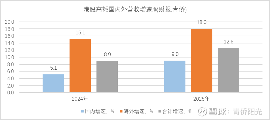 我们可以将港股高耗营收按国内外做进一步拆分,未披露海外收入的全部假设为国内收入。如下图所示,2024年海外收入增速比国内高10个百分点(15.1% VS 5.1%),2025年国海外收入增速比国内高9个百分点(18.0% VS 9.0%),出口增速大幅高于国内增速。而且上述高耗出海营收里是包含了微创和爱康等公司收购的海外子公司营收的,这些收购来的海外品牌营收不小但增速很低,若只考虑非收购的自有品牌,国产高耗的出海增速预计达到30%及以上。